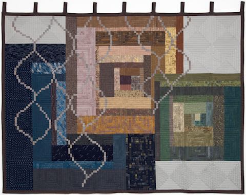コメント : この面は「ログキャビン」をテーマに取り組みました。「ログキャビン」をリバーシブルログキャビンでどう表現したものか、しばし考えました。 青系、茶系、緑系、の大きなログキャビンブロック3枚を、途切れた網のようなものを通して見ている感覚です。