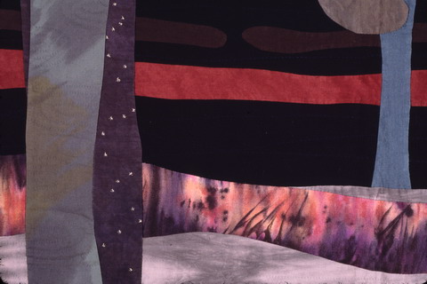 コメント : 何もかもが凍てついた冬にも、それを溶かす春は必ずやってくるもの。氷柱が溶けていくさまは、寒い冬が足早に立ち去っていくようで・・・・。キラキラと、クリスタルのように冷たく、美しく舞い上がった雪煙も、だんだんと丸くなり、はかなく、たよりなくなっていきます。定規、コンパスをいっさい使わずに、すべてフリーハンドで型紙を起こし、できるだけミシンでピーシングをやり、水玉や、先の丸いところだけ手縫いです。