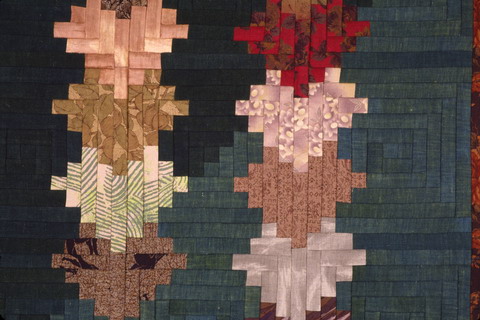 コメント : 山々はまだ緑だけど、よく見ると葉の先はもう秋色に染まり始めている。燃えるような美しい山々を覆うようになるのも、そんなに遠くはない・・・。そんな秋の色を待ち望む気持ちを表しています。 IQM 国際キルト博物館(ネブラスカ州 リンカーン)所蔵